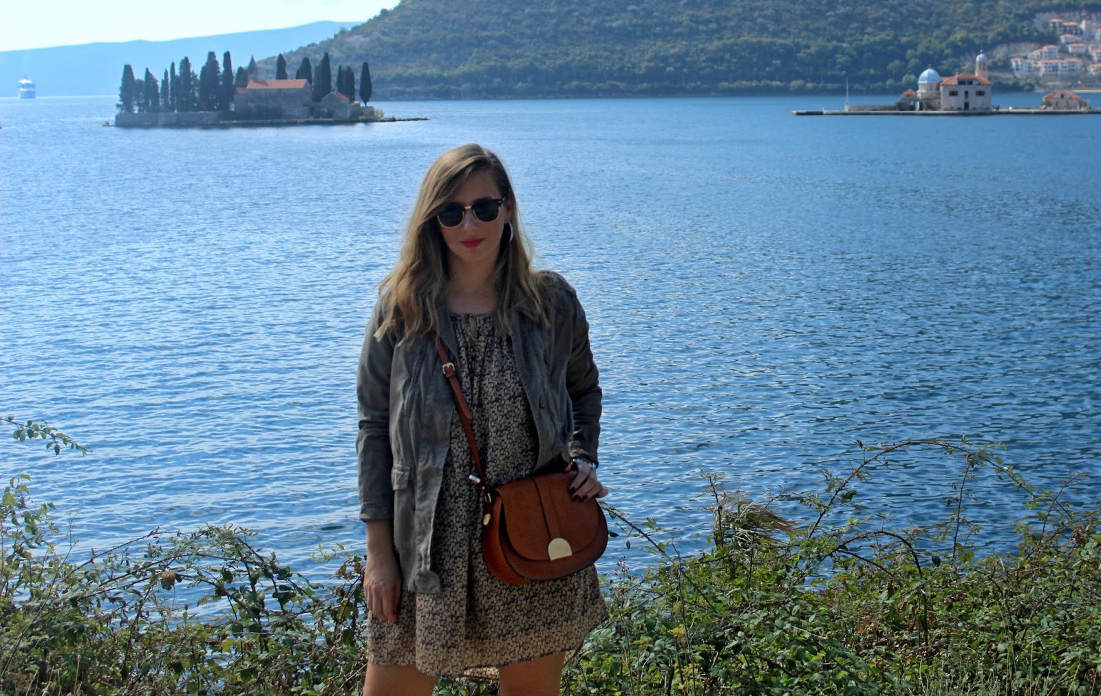 Olive green military jacket (from one of my first posts on this blog from Karuc: here), off-the shoulder floral dress (from my post from Ulcinj: here), camel bag, ankle boots and my favorite place in Montenegro: the beautiful Boca Bay of Kotor.